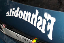 The word 'Fishmobile' is done in white spray paint (and done backwards on the front of the van, so it is readable in a rearview mirror).